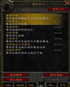 首领报警,熔火之心MC,黑翼之巢BWL,安其拉TAQ,纳克萨玛斯NAXX等团队副本,及野外BOSS首领报警。