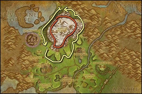 希尔斯布莱德丘陵的奥特兰克山脉绝对是采集锡矿石的最佳地点,地图上用红色标记。如果矿脉被采完了,就绕山一圈等它们刷新。对于低等级联盟玩家来说,这里是部落区域,可能稍微难以到达。